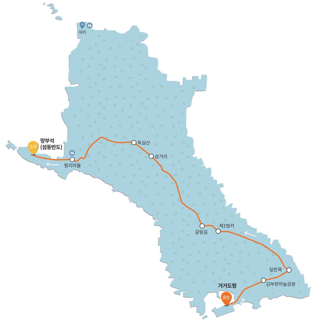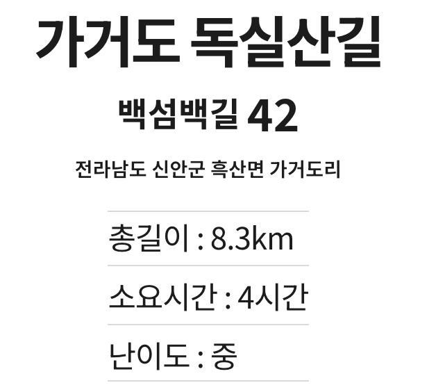 가거도항(0km) → 김부련 하늘공원(1.2km) → 달뜬목(0.3km) → 제1벙커(1.2km) → 삼거리(2.8km) → 독실산 정상(0.5km) → 항리마을(1.5km) → 망부석/섬둥반도(0.8km)