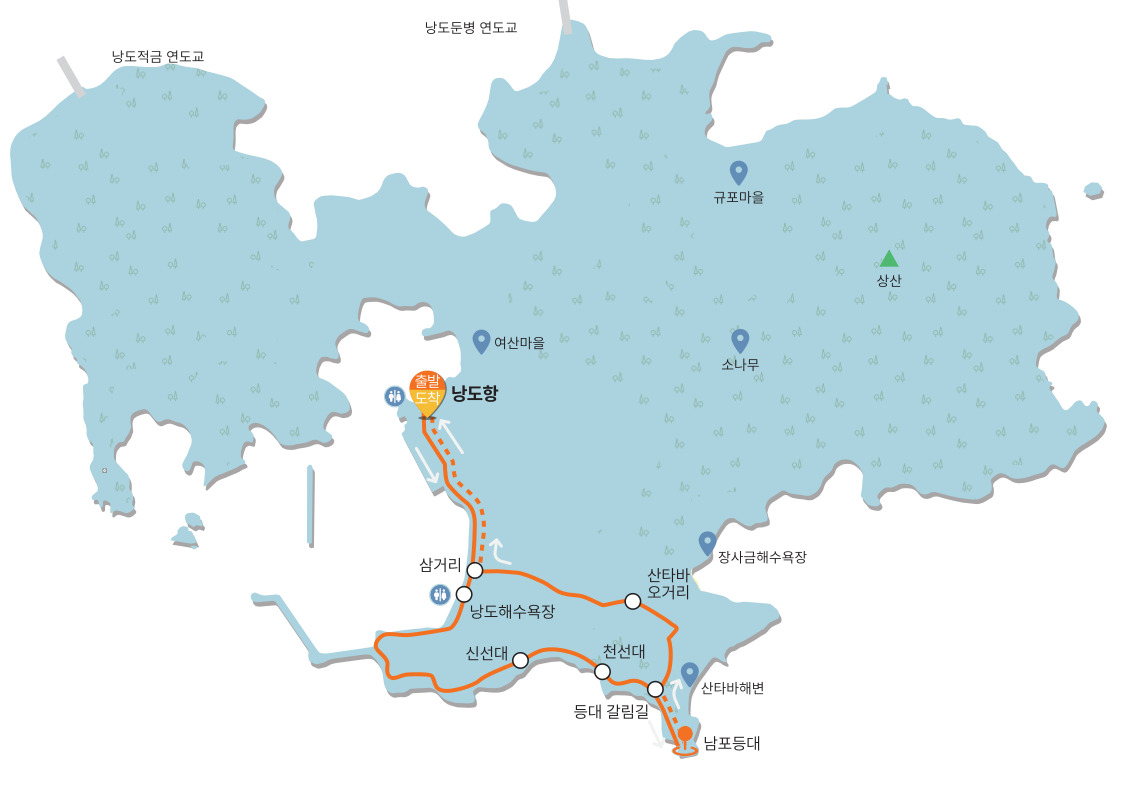 - 낭도항 (출발): 잔잔한 어항의 활기를 느끼며 시작합니다.