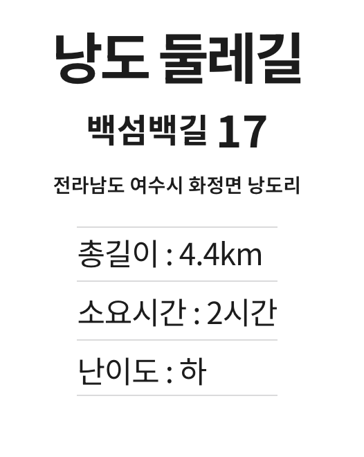 낭도는 걷기 여행자들에게는 천국과 같은 곳입니다. 마을길, 숲길, 해안길이 조화롭게 어우러져 있으며 본인의 체력에 맞는 코스를 선택할 수 있다는 것이 큰 장점입니다.