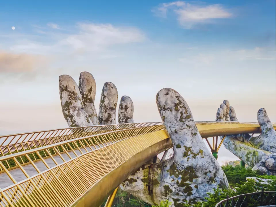 바나힐의 대표적인 랜드마크인 골든 브릿지는 거대한 손 모양이 다리를 받치고 있는 독특한 디자인으로 유명합니다. 브릿지 위에서 바라보는 자연 풍경과 구름의 조화는 환상적이며, 이곳에서의 사진 촬영은 모든 방문객들의 필수 코스입니다.