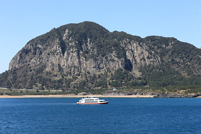 - 산방산: 해발 395m의 독특한 화산 분출암 산체를 해상에서 조망.