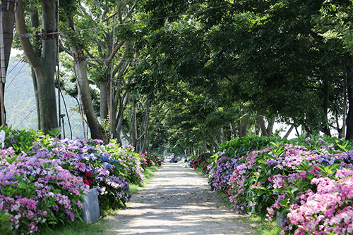 월포천 옆 둑길을 따라 이어지는 이 길에는 전국 각지에서 기증받은 100년 수령의 팽나무 716그루가 심겨 있습니다. 팽나무 아래에는 수국이 함께 자라고 있어, 초록빛 터널과 보랏빛 꽃길을 동시에 만끽할 수 있습니다.