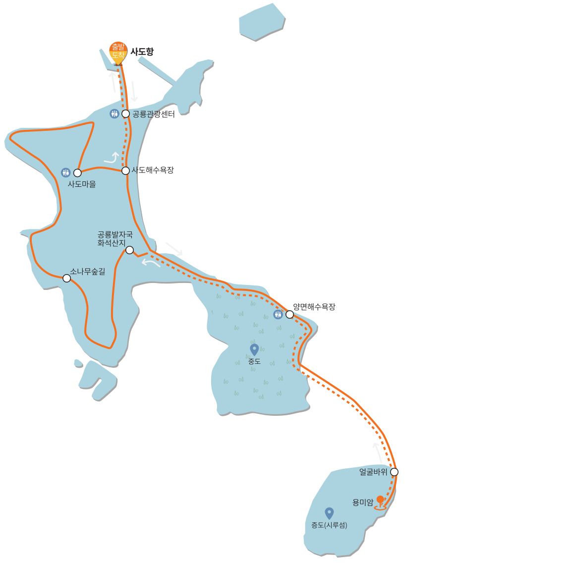사도 선착장 → 사도 마을(돌담길) → 사도교(중도 연결) → 양면해수욕장 → 거북바위/얼굴바위 → 용미암(시루섬) → 공룡테마공원 → 선착장