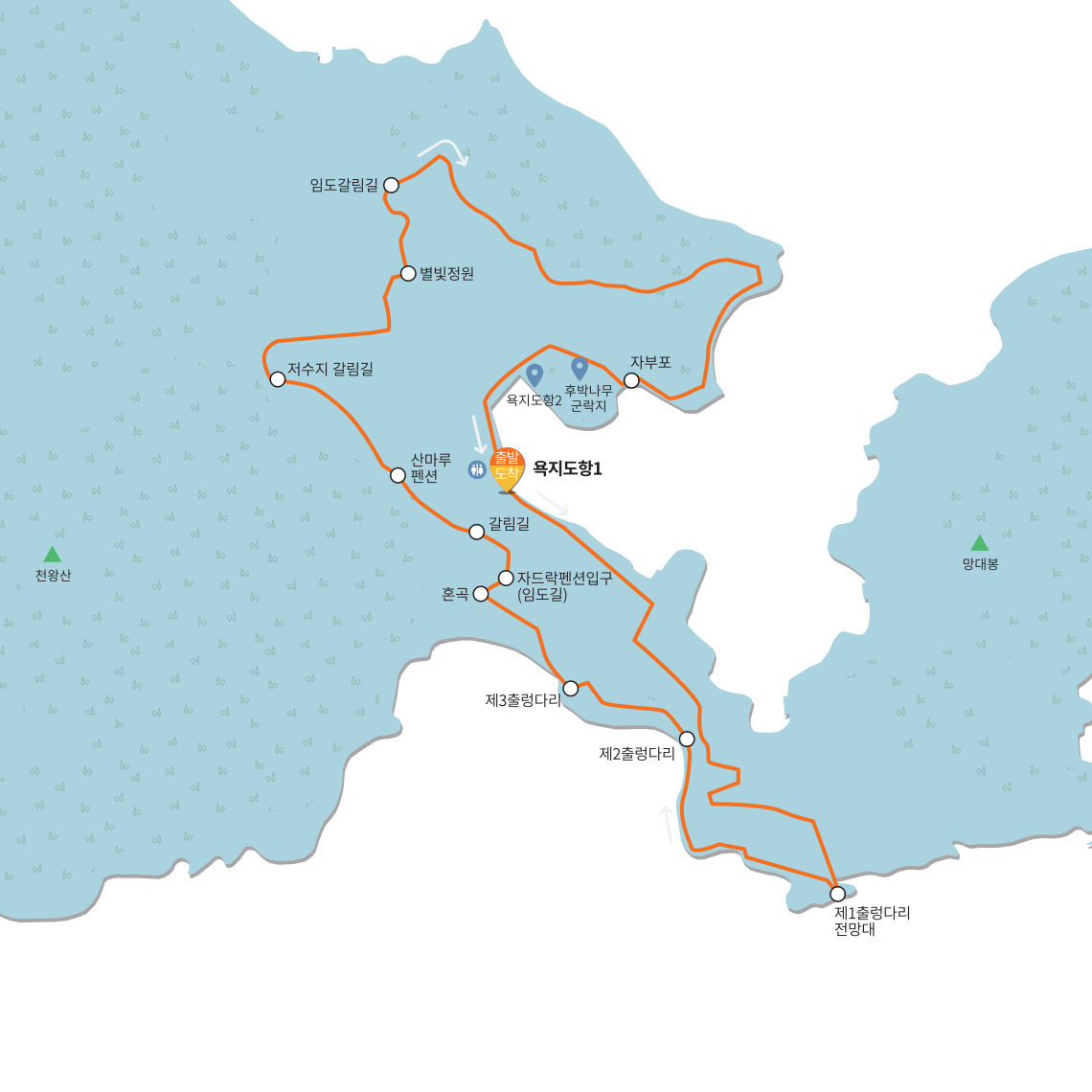 욕지도항에서 출발해 섬의 해안선을 따라 3개의 출렁다리를 모두 섭렵하고 다시 항구로 돌아오는 순환 코스입니다.