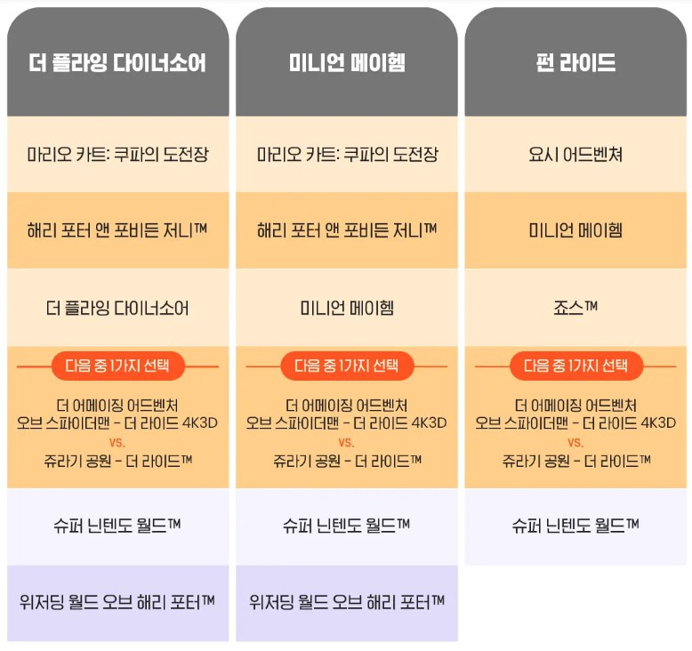 - 닌텐도 월드, 해리포터 존 등 인기 구역 입장은 별도 시간 예약이 필요할 수 있습니다.