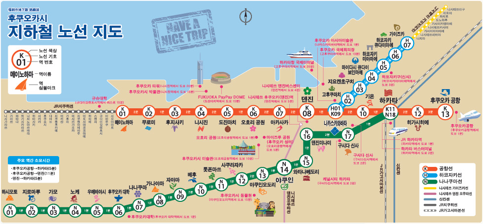- 환승: 나카스카와바타 역에서 공항선과 하코자키선 간 환승이 가능합니다. 나나쿠마선은 덴진미나미 역과 하카타 역에서 다른 노선과의 환승이 용이합니다.