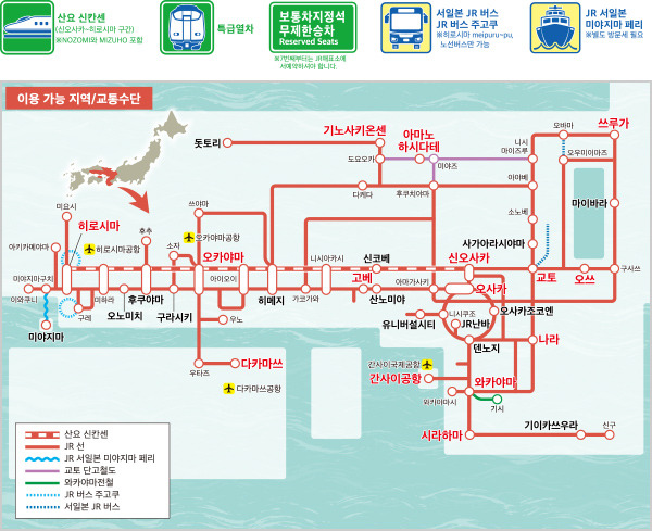 신오사카와 도쿄 구간의 도카이도 신칸센, 히로시마와 하카타 구간의 산요 신칸센, 하카타와 가고시마 및 추오 구간의 규수 신칸센을 이용할 수 없습니다.